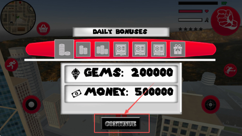 2、领取奖励:进入游戏后,点击“DAILY BONUSES”领取每日奖励,点击“CONTINUE”继续游戏。