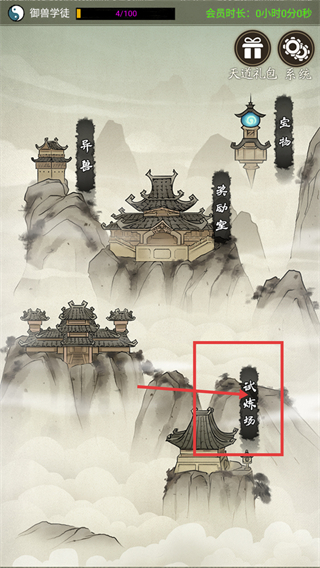 1、进入【御兽学徒-4/100】界面,找到标注的【武炼场】,该建筑可用于提升异兽战力,结合当前进度推进养成。