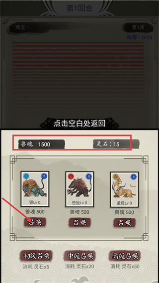 2、在召唤界面,可用【兽魂-500】召唤【獬Lv0】等异兽,也可消耗【灵石-5】选择初级召唤来补充己方战力。