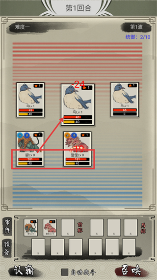 3、于【第1回合-第1波】对战中,派出【獬Lv0】【蜚侄Lv0】对抗【鸟Lv1】,关注敌方血量变化以推进战斗。