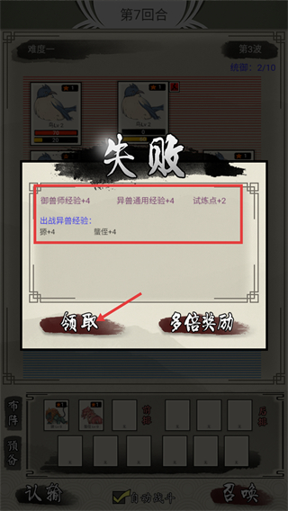 4、【第7回合】战斗失败后,点击【领取】可获取【御兽师经验+4】等奖励,积累资源为后续挑战做准备。