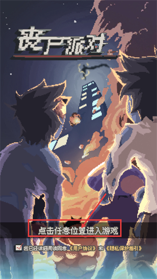 1、在【丧尸派对】启动界面,勾选【用户协议】和【隐私保护指引】后,点击任意位置即可进入游戏,开启关卡挑战。