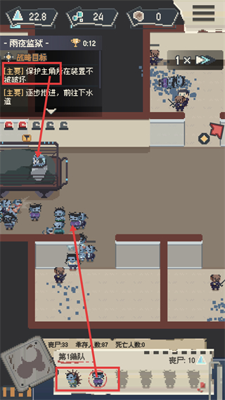 2、进入【雨夜监狱】关卡,战略目标为【保护主角所在装置不被破坏】与【前往下水道】,操控【第1编队】抵御丧尸推进进度。