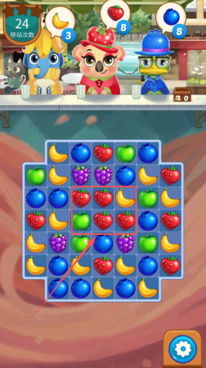 2、匹配消除水果:观察屏幕中水果分布,滑动手指将相同水果连成三组及以上,触发消除效果,积累消除进度。