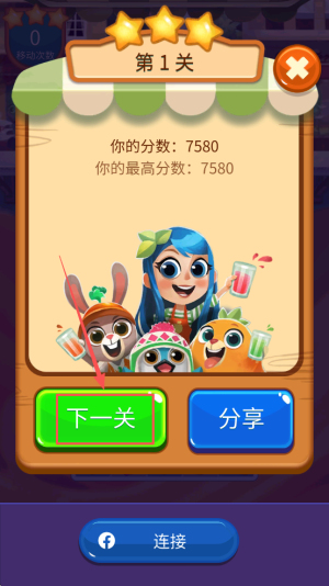4、完成关卡:在第1关你的分数7580界面点击下一关继续挑战。