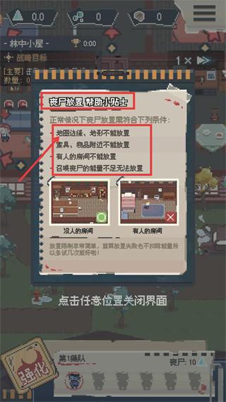 1、在【林中小屋】界面,查看【丧尸放置-帮助小贴士】,需避开地图边缘-家具附近-有人房间放置,能量不足也无法放。