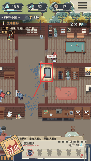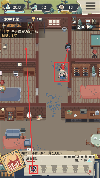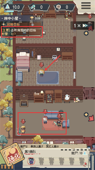3、【林中小屋】目标进度【3/7】,操控【第1编队】的丧尸击败标注目标,关注【幸存人数-4】【死亡人数-3】的局势调整策略。