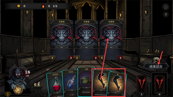2、战斗中会出现多个【石海魔】敌人,可使用手牌中的攻击类卡牌对其发起攻击,需留意自身状态并适时点击【结束回合】。