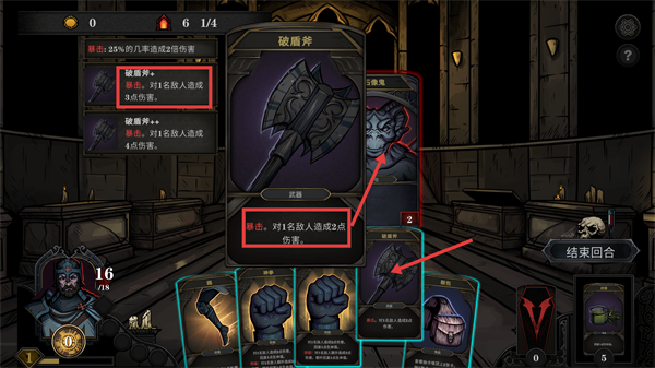 3、【破碎斧】卡牌初始可对1名敌人造成伤害,升级后效果强化为对1名敌人造成2点伤害,能有效提升对战中的输出效率。
