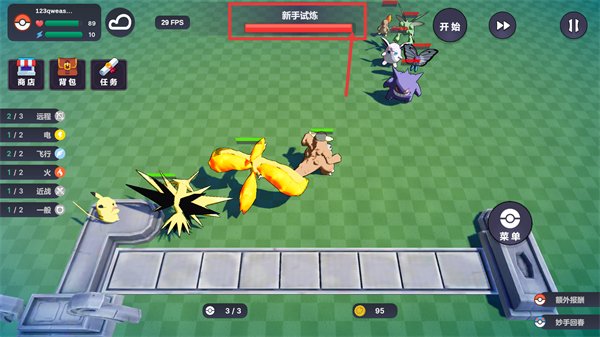 4、【新手试炼】进程里,我方部署含【远程】-【电】等属性的宝可梦,依托其属性优势对抗敌方以推进试炼进度。