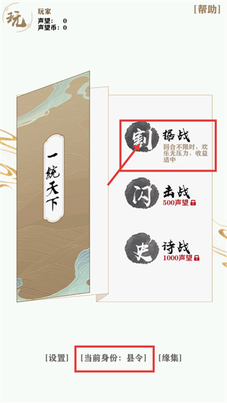1、【一统天下】界面中【当前身份:县令】,可选择【割据战】-回合不限时-欢乐无压力-收益适中的模式开启对局,积累声望与声望币。
