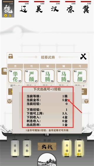 2、【招募武将】界面显示当前等级-1级-当前金币-5金,1金币可加1经验,升级后下级可上阵-3人,下次出战可+1经验。