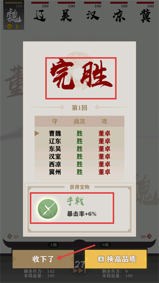 4、【第1回】对战达成【完胜】,可获得宝物【手戟-暴击率+6%】,点击【收下了】即可获取该增益道具。