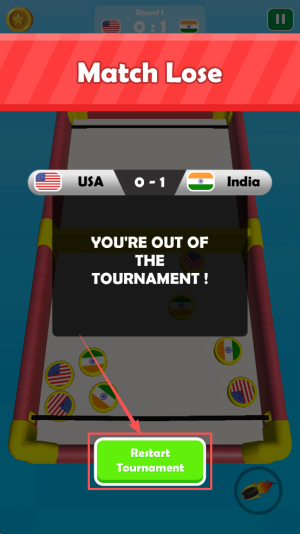4、结束比赛:显示Match Lose 0-1时点击Restart Tournament重新挑战。