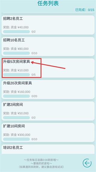 1、在【任务列表】中关注【升级5次房间家具】任务,完成可获【资金-¥10,000】奖励,需优先推进该任务积累收益。