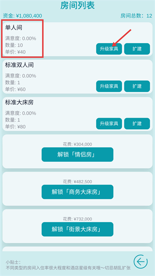2、在【房间列表】中选择【单人间】,点击其右侧的【升级家具】按钮,开启家具升级流程以推进任务。