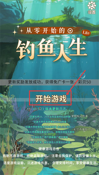 1、点击【开始游戏】进入【从零开始的钓鱼人生-Lite】,可获取更新奖励【免广卡-一张】与【彩贝-50】,开启钓鱼玩法。