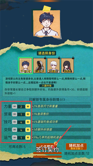 2、选择【平平无奇】身份后,分配【可用点数-5】,优先加【技巧】提升基础钓鱼成功率,激活【八面玲珑】天赋拿额外收益。