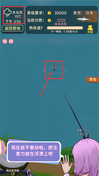 3、进入钓鱼界面后,按提示关注【浮漂】,保持操作稳定,留意【当前分数-3720】与【晋级要求-30000】,积累熟练度。