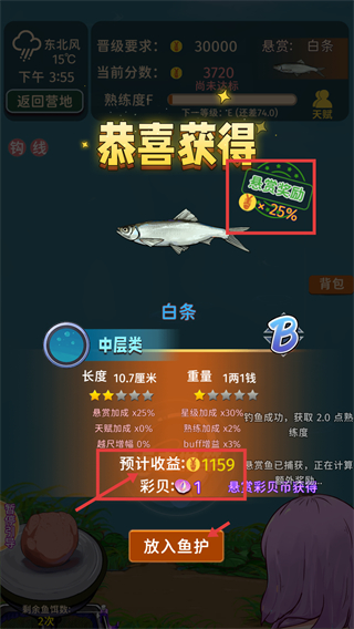 4、钓到【白条】后,点击【放入鱼护】获取【预计收益-¥1159】与【彩贝-1】,借助【悬赏奖励-+25%】提升收益效率。