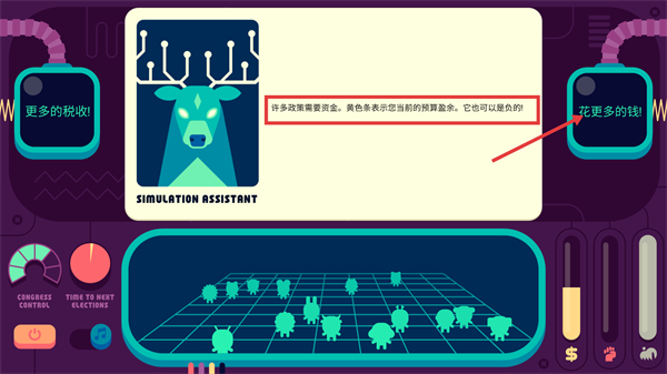 3、关注【预算盈余】黄色条,通过【更多的税收!】或【花更多的钱!】调整资金,支撑后续政策的执行资源。