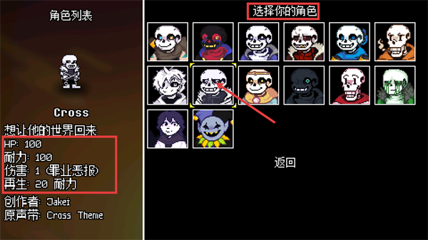 1、在【角色列表】选择【Cross】,其属性含【HP-100】【伤害-1(罪业恶报)】,选该角色可体验专属技能与剧情设定。