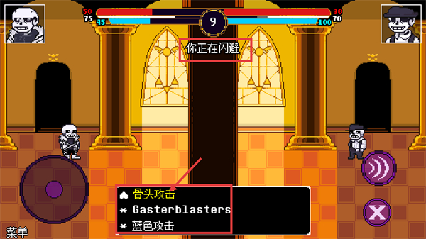 2、战斗处于【你正在闪避】状态时,可选用【骨头攻击】【Gasterblasters】等技能,同时规避敌方攻势以维持血量。