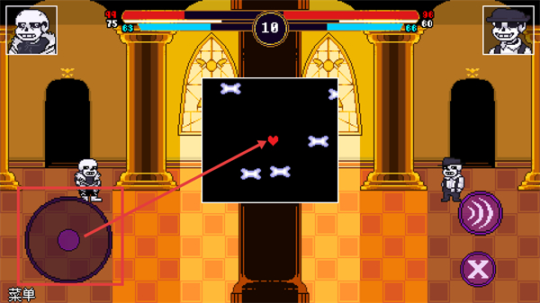 3、点击【虚拟摇杆】触发躲避环节,操控界面内的【爱心】,避开场景中的【骨头】类攻击道具,完成该阶段操作。