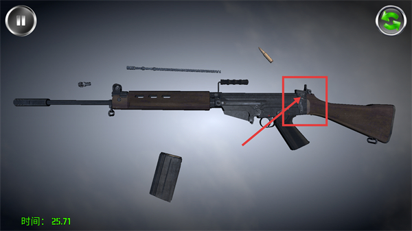 2、关注界面显示的【时间-25.71】,按照红色标注的部件位置,依次进行枪械的拆解步骤,确保每个部件都正确分离。
