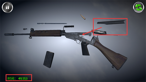 3、注意【时间-49.553】的计时进度,针对红色标注的部件,完成该部分的拆解操作,推进枪械拆解的流程。