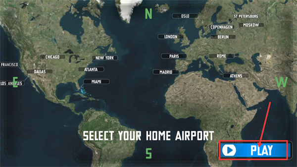 1、界面显示【SELECT-YOUR-HOME-AIRPORT】,选定家乡机场后,点击【PLAY】按钮,即可进入游戏的后续操作环节。