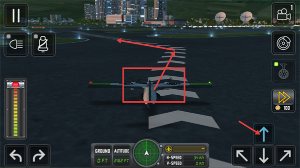 3、飞机处于跑道时,借助方向按钮调整姿态,同时关注【GROUND-0-FT】等参数,确保飞机在跑道上稳定准备。