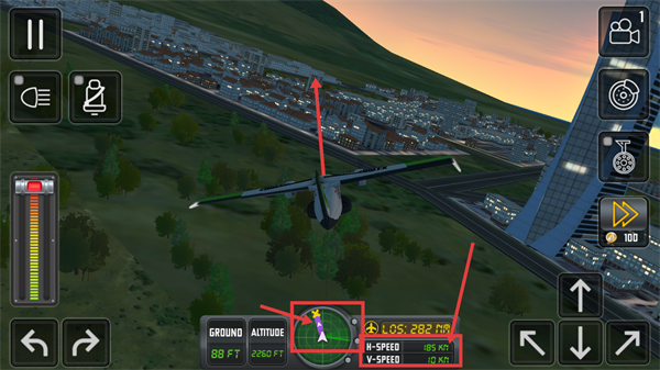 4、飞行过程中留意【H-SPEED-185-KM】【V-SPEED-10-KM】参数,结合罗盘调整方向,维持正确航线。