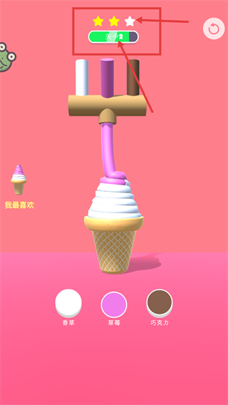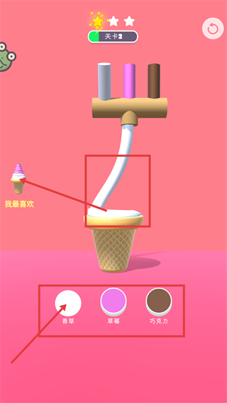 1、在【关卡2】中,确认目标冰淇淋为【我最喜欢-香草-草莓-混合款】,准备通过下方【香草】【草莓】【巧克力】按钮选择对应原料制作。