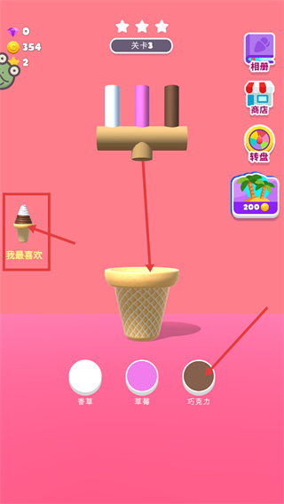 3、在【关卡3】中,点击下方【巧克力】按钮,让机器挤出对应口味至蛋筒,完成该层原料添加以推进关卡进度。
