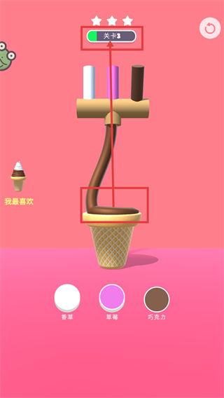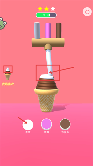 2、进入【关卡3】,确认目标为【我最喜欢-巧克力-香草-混合款】,准备通过下方【香草】【草莓】【巧克力】按钮选对应原料制作。