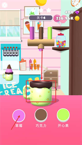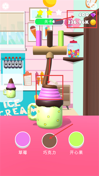 3、进入【关卡4】,目标为带【巧克力-顶的绿色杯子款】,先点击【巧克力】按钮添加顶层原料,推进关卡制作进度。
