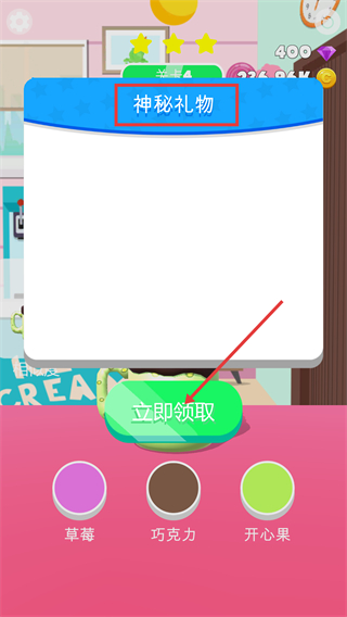 1、触发【神秘礼物】弹窗后,点击【立即领取】获取奖励,可结合下方【草莓-巧克力-开心果】原料选项,为后续制作做准备。