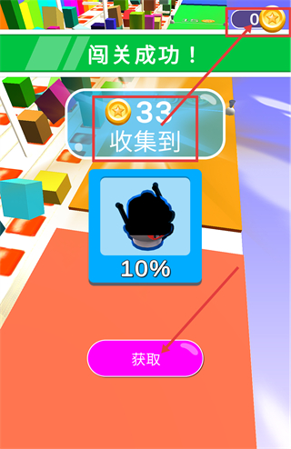 4、达成【闯关成功】后,确认收集到【33-金币】,点击【获取】领取奖励,同时解锁物品的【10%-进度】。
