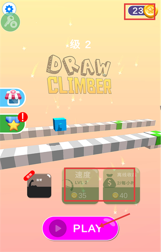 1、在【DRAW-CLIMBER-级2】界面,点击【PLAY】开启关卡,可消耗【35-金币】升级【速度-LV2】,提升攀爬移动的效率。
