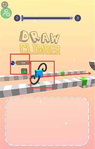 2、在关卡中绘制【曲线-形状】,操控【蓝色方块】推进移动,追赶对手【Ava】,同步推进【进度条-2-3】的关卡进程。
