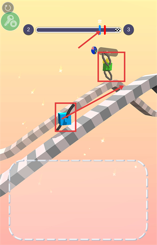 3、在弯道区域借助绘制的【装置】,维持【蓝色方块】的移动节奏,缩小与对手之间的进度差距。