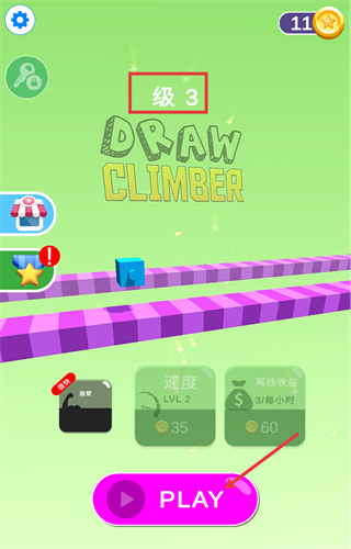 1、在【DRAW-CLIMBER-级3】界面,点击【PLAY】开启关卡,可消耗【35-金币】升级【速度-LV2】提升移动效率和升级离线收益。