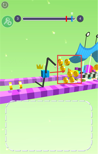 3、靠近场景内的【金币堆】,借助绘制的装置维持移动节奏,在收集金币资源的同时缩小与终点的进度差距。