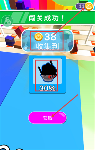 4、达成【闯关成功】后,确认收集到【38-金币】,点击【获取】领取奖励,同时解锁对应物品的【30%-进度】。