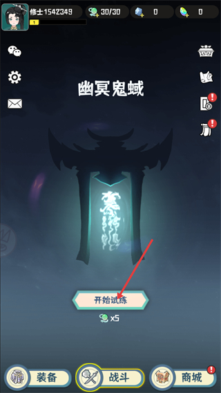 1、进入【幽冥鬼域】界面,底部【战斗】按钮为试炼入口,点击【开始试炼】需消耗5个绿色道具。