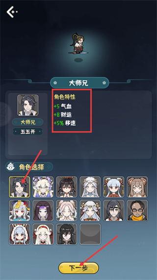 2、【角色选择】时,【大师兄】有【+5-气血】【+8-财运】【+5%-移速】特性,选定后点击底部【下一步】即可继续流程。