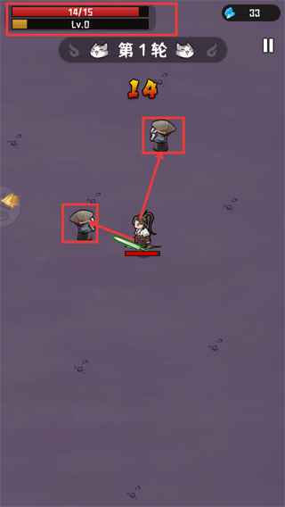 3、战斗处于【第1轮】,需攻击带斗笠的敌人,顶部【14/15】为进度条,【Lv.0】显示当前等级,右侧有【33】蓝色钻石可关注。