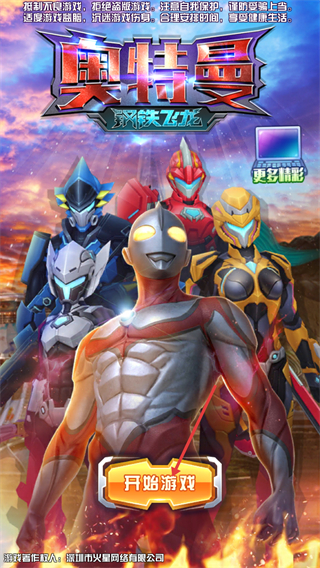 1、进入【奥特曼-钢铁飞龙】启动界面,点击中间【开始游戏】按钮进入关卡,同时可留意右上角【更多精彩】按钮查看额外内容。