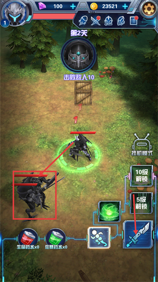 2、处于【第2天】关卡,目标为【击败敌人-10】,右侧有【挂机模式-10级解锁】,底部有道具栏,还可关注【5级解锁】的装备栏。